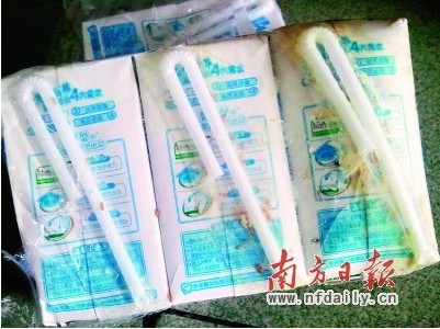 4月19日晚,家住東莞長安錦廈新村的謝先生經(jīng)不住兒子的央求,在附近的百佳超市買了一箱生產(chǎn)日期標(biāo)明為“20120302”的蒙牛兒童牛奶回家??蓴?shù)日后他才發(fā)現(xiàn),箱內(nèi)部分未拆包裝的牛奶外殼上長滿蟲子,這讓全家人對已喝了幾盒這箱牛奶的兒子的健康擔(dān)心不已。