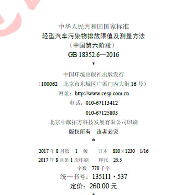 國(guó)六標(biāo)準(zhǔn)的全文,有400頁(yè)之巨,可在中華人民共和國(guó)生態(tài)環(huán)境部官網(wǎng)下載到電子版——如果你有興趣翻到最后一頁(yè),還會(huì)發(fā)現(xiàn)這套標(biāo)準(zhǔn)已有書(shū)刊號(hào)、且印刷出版,定價(jià)260元。