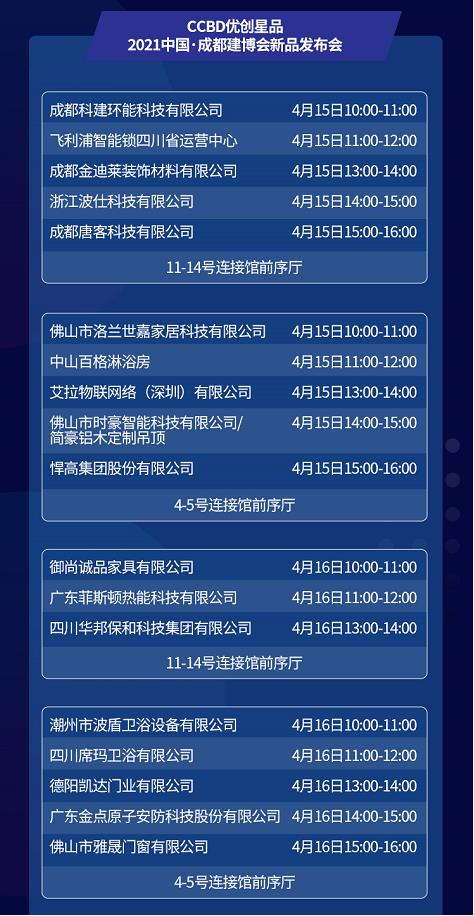 成都建博會(huì)作為中西部最大行業(yè)展會(huì),對(duì)于很多經(jīng)銷商和渠道商而言,這里不僅是一次商貿(mào)對(duì)接會(huì),更是一場(chǎng)行業(yè)新品發(fā)布會(huì),行業(yè)品牌都會(huì)選擇展會(huì)平臺(tái),發(fā)布新品爆款。展會(huì)組委會(huì)將聯(lián)合18家參展品牌企業(yè)舉辦“CCBD優(yōu)創(chuàng)星品——2021中國成都建博會(huì)新品發(fā)布會(huì)”,為市場(chǎng)和用戶揭曉大家居建裝市場(chǎng)所涌現(xiàn)出的一系列新產(chǎn)品、新方案、新技術(shù),助力展商和觀眾之間實(shí)現(xiàn)合作。