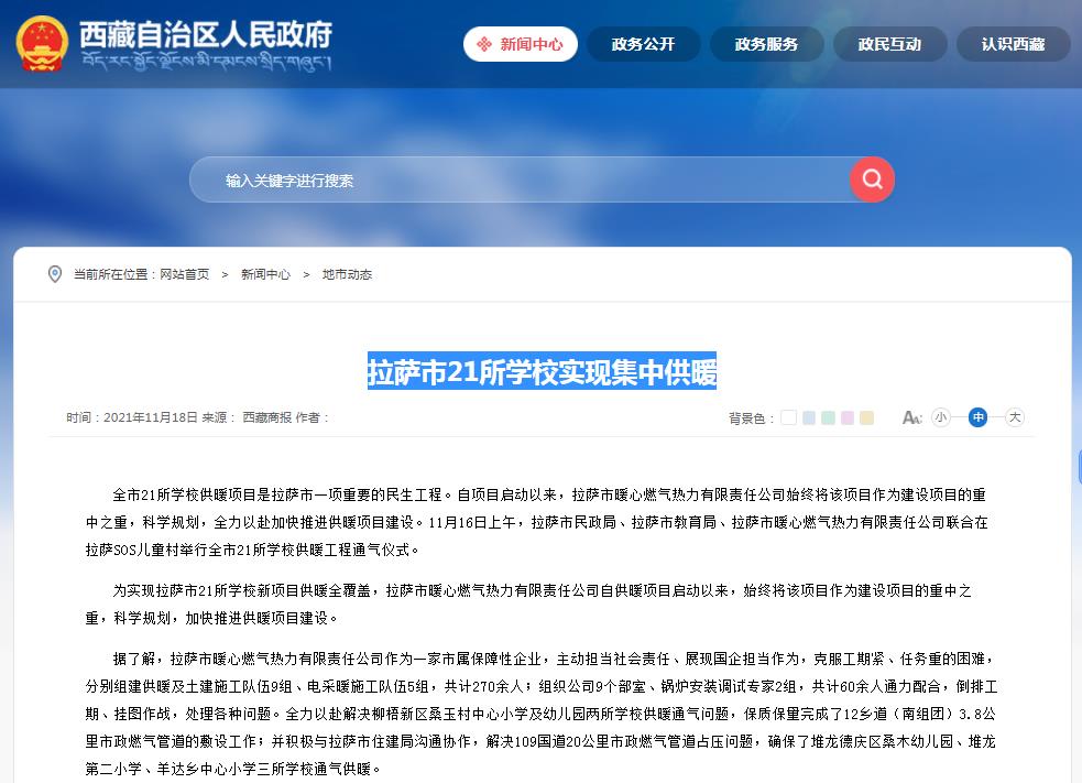 11月16日上午,西藏拉薩市民政局、拉薩市教育局、拉薩市暖心燃?xì)鉄崃τ邢挢?zé)任公司聯(lián)合在拉薩SOS兒童村舉行全市21所學(xué)校供暖工程通氣儀式。截至目前,由拉薩市暖心燃?xì)鉄崃τ邢挢?zé)任公司承建的城關(guān)區(qū)11所學(xué)校、堆龍德慶區(qū)6所學(xué)校、柳梧新區(qū)3所學(xué)校和拉薩SOS兒童村,共計21所學(xué)校全部按期完成庭院燃?xì)夤艿馈⒐┡艿兰皯魞?nèi)供暖設(shè)施設(shè)備的安裝,并已實現(xiàn)供暖點火。其中,16所學(xué)校為氣供暖,5所學(xué)校為電供暖,集中氣供暖時間與全市其他學(xué)校同步,從11月15日至次年3月15日。