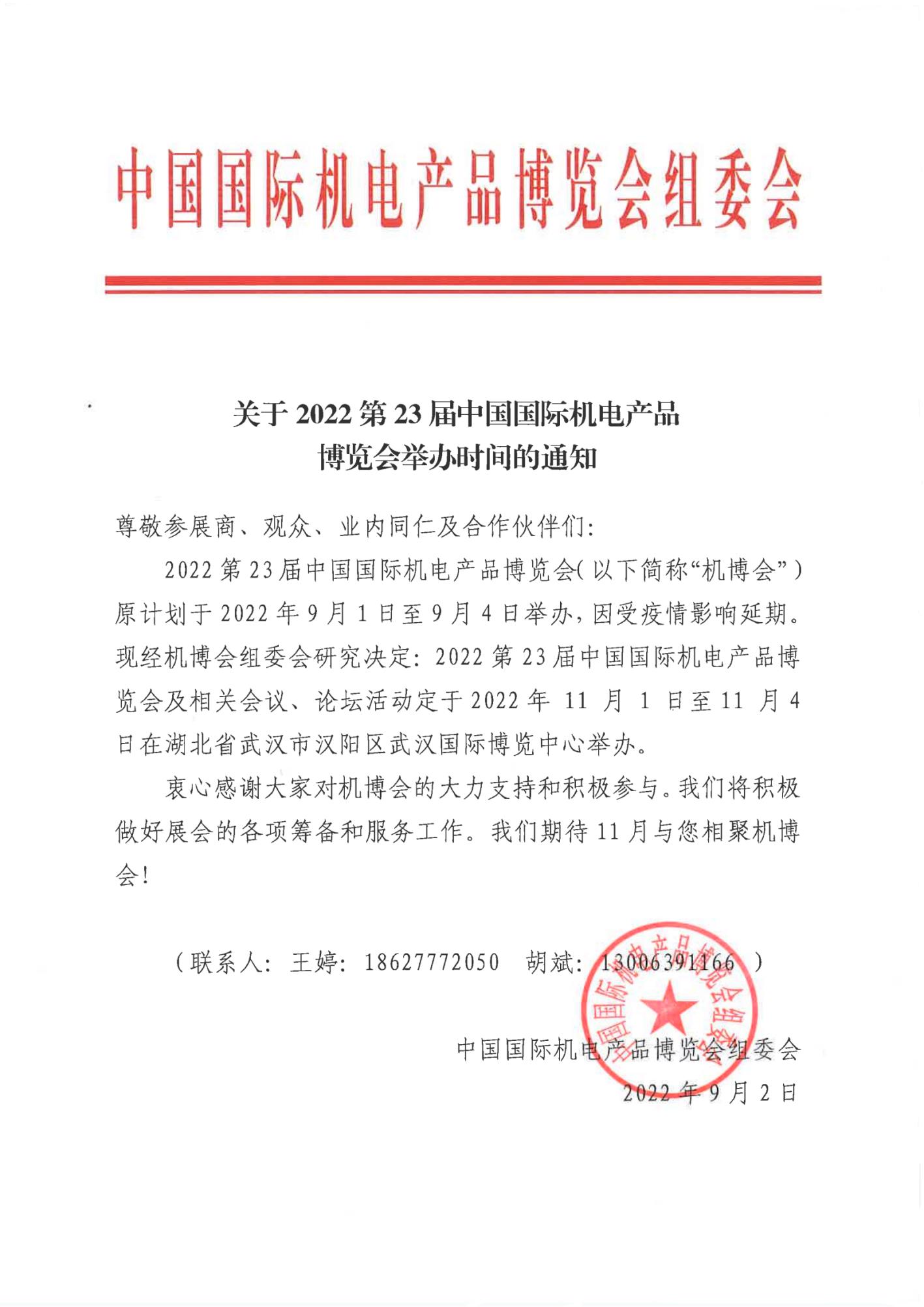 2022第23屆中國國際機(jī)電產(chǎn)品博覽會(以下簡稱“機(jī)博會”)暨第11屆武漢國際機(jī)床展,原計劃于2022年9月1日至9月4日舉辦,因受疫情影響延期?,F(xiàn)經(jīng)機(jī)博會組委會研究決定:2022第23屆中國國際機(jī)電產(chǎn)品博覽會暨第11屆武漢國際機(jī)床展及相關(guān)會議、論壇活動定于2022年11月1日至11月4日在湖北省武漢市漢陽區(qū)武漢國際博覽中心舉辦。