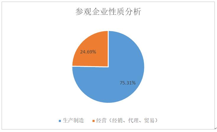 據(jù)展會(huì)組委會(huì)統(tǒng)計(jì),本次展會(huì)參觀企業(yè)達(dá)6341家,從企業(yè)性質(zhì)總數(shù)量占比來(lái)看,生產(chǎn)制造企業(yè)占75.31%,經(jīng)營(yíng)(經(jīng)銷、代理、貿(mào)易)企業(yè)占24.69%,兩者合計(jì)占100%。由此可以看出,在參觀企業(yè)中,以生產(chǎn)制造企業(yè)為主,占比較大。