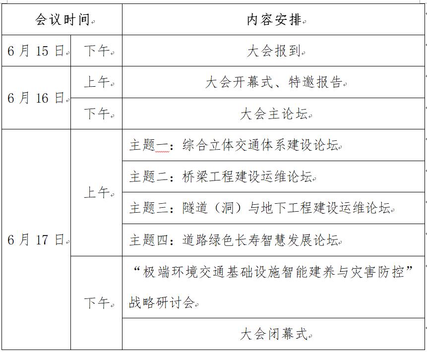 大會(huì)將以“極端環(huán)境交通基礎(chǔ)設(shè)施智能建養(yǎng)與安全”為主題,邀請國內(nèi)外院士及知名專家發(fā)表橋隧科技創(chuàng)新前沿及戰(zhàn)略發(fā)展相關(guān)報(bào)告,報(bào)告內(nèi)容涵蓋當(dāng)前橋隧領(lǐng)域重大前瞻性、關(guān)鍵性技術(shù)問題、基礎(chǔ)理論研究、科技創(chuàng)新、經(jīng)驗(yàn)總結(jié)、工程實(shí)踐及產(chǎn)業(yè)發(fā)展等方面,報(bào)告將體現(xiàn)橋隧領(lǐng)域最新科技成果和水平,共同打造創(chuàng)新、交流與合作的學(xué)術(shù)大平臺(tái)。大會(huì)由開幕式、主論壇、主題論壇、戰(zhàn)略研討會(huì)、橋隧工程科技創(chuàng)新展、論文征集等組成。